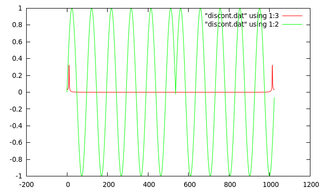 You can see that he discontinuity has caused the sharp peak in the transform to be smeared out over several frequency values. This is called Spectral leakage.
