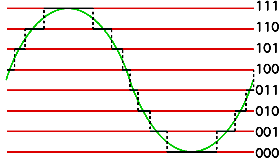 The diagram below shows how a smooth (analogue) waveform is quantised into the 8 possible values representable in a 3 bit variable. The difference between the true value and the quantised version is called the "quantisation noise" and is represented by the red line in the previous diagram.