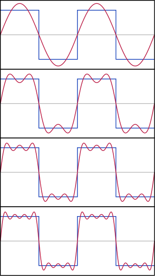 The reverse process to Fourier Analysis is Fourier Synthesis. The diagram below shows how a square waveform can be synthesised by adding together a series of sine waves.