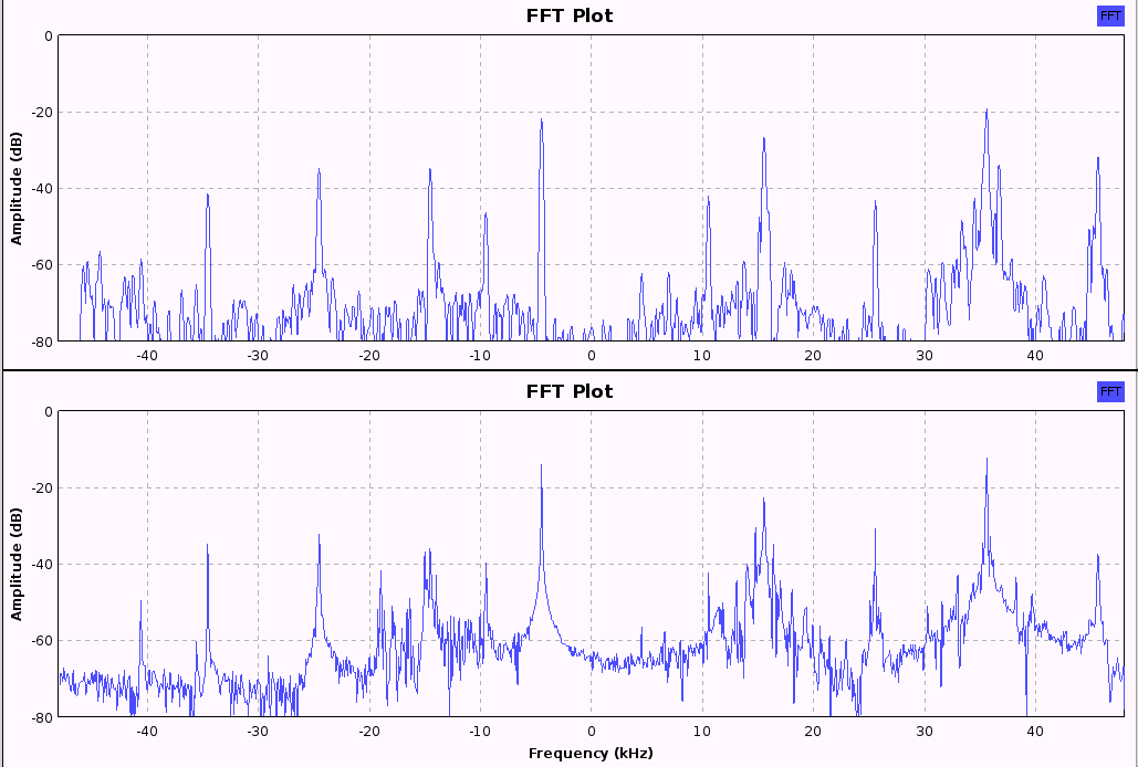 And finally, here are a couple of plots of the FFTs of some real world signals. The input signals are taken from the Shortwave Radio "41 meter band". The center frequency is 7.270Mhz, and the signals were sampled at 96kHz. The first pair of graphs show FFT results first with and then without the use of a windowing function. The peaks correspond to the "carrier wave" for each station at -35,-25,-15,-10,-5,+10,+15,+25,+35 and +45kHz. The peaks are much more clearly defined in the top graph, and the effects of frequency leakage can be clearly seen in the bottom graph.