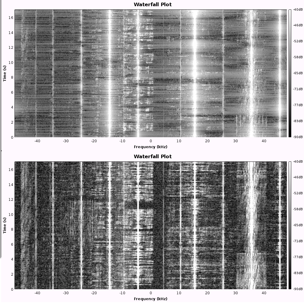 The next diagram shows the "waterfall" displays for the same signals. These have time on the vertical axis and show the amplitude of signals at each frequency using brightness. This time the non-windowed version is shown first