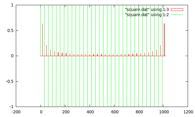 In fact the second half of the transform result contains a mirror image of the first half. This is more clearly shown in the next example which shows the FFT result for a sampled square wave which fits 16 cycles exactly into 1024 samples.