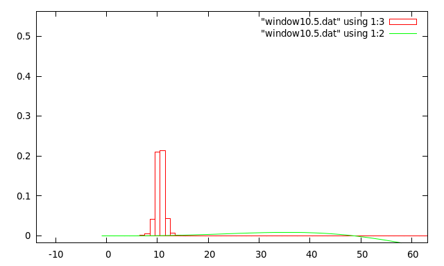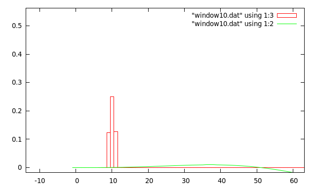 The blue curve shows the windowing function that has been used to shape the sampled data. This particular windowing function is called a Hanning window. BUT since we have changed the input to the FFT we must expect the output to have changed as well. The next diagram shows the transform of the ideal 10 cycle sine wave with the window applied: