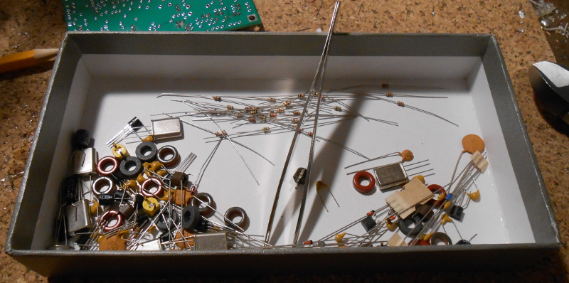 IC sockets, capacitors,discrete semiconductors,ICs,inductors and finally the crystals.