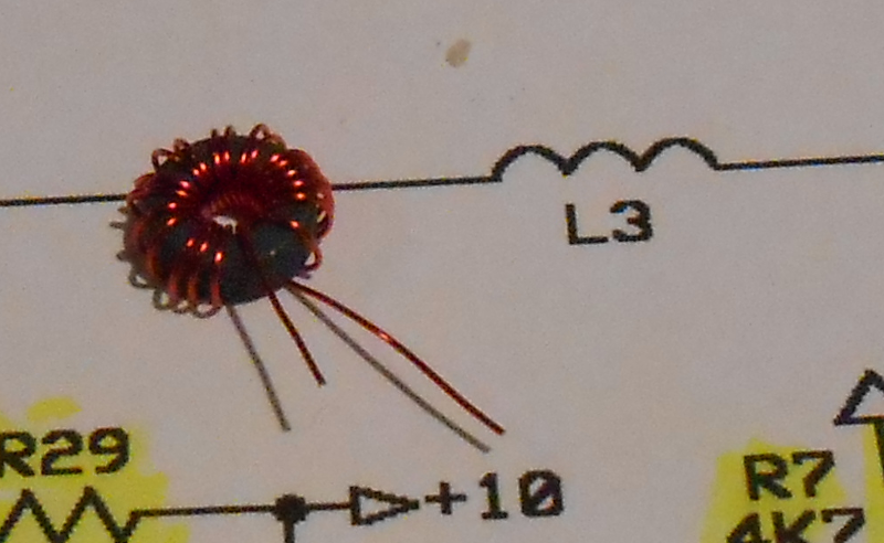 into their holes at the same time. If you cut them all to slightly different length, you can insert them one by one. Here is L3 with leads cut to demonstrate the technique.