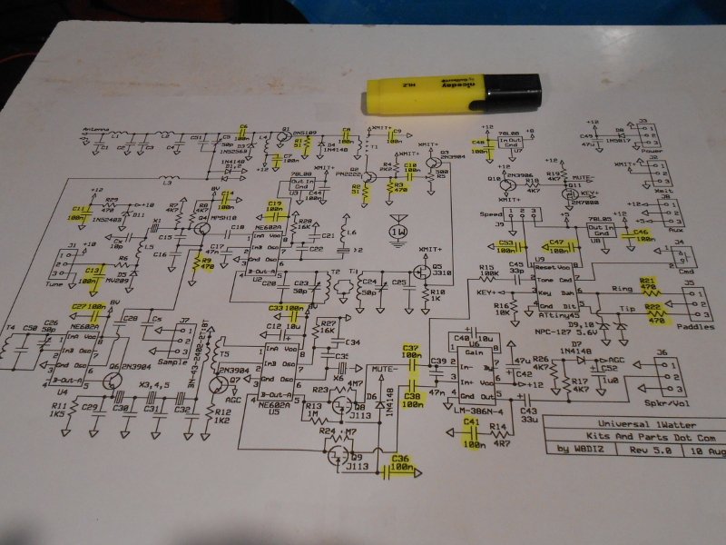 I printed out an A3 sized copy of the schematic so that I could cross out the parts as I installed them. Actually I cut the schematic in half and printed each half on A4 and then taped