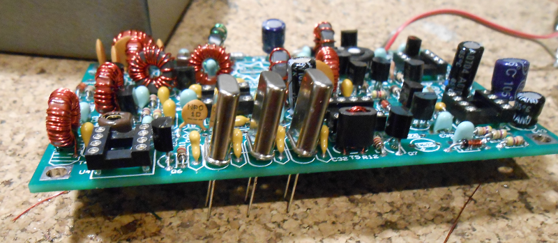 This picture shows the suggested technique to mount the crystals to ensure there is a small gap between their metal can and the board.