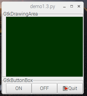 The offButton handler uses a global variable "da" which holds the value retrieved from the builder with builder.get_object("drawingarea1").
