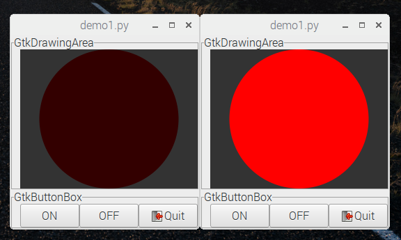 The large red dot is either OFF (Dull Red, shown in the window on the left) or ON (Bright Red, shown in the window on the right). Pressing the button labelled "ON" turns the dot on, and pressing the button labelled "OFF" turns it off ! Pressing the button labelled "Quit" has a similarly predictable effect.