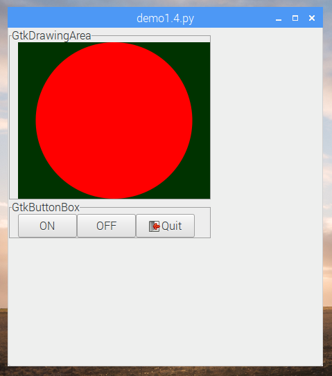 001: <?xml version="1.0" encoding="UTF-8"?> 002: <!-- Generated with glade 3.16.1 --> 003: <interface> 004: <requires lib="gtk+" version="3.10"/> 005: <object class="GtkWindow" id="window1"> 006: <property name="visible">True</property> 007: <property name="can_focus">False</property> 008: <property name="gravity">center</property> 009: <signal name="delete-event" handler="on_window1_delete_event" swapped="no"/> 010: <child> 011: <object class="GtkBox" id="box1"> 012: <property name="visible">True</property> 013: <property name="can_focus">False</property> 014: <property name="orientation">vertical</property> 015: <child> 016: <object class="GtkFrame" id="frame1"> 017: <property name="visible">True</property> 018: <property name="can_focus">False</property> 019: <property name="label_xalign">0</property> 020: <property name="shadow_type">out</property> 021: <child> 022: <object class="GtkAlignment" id="alignment1"> 023: <property name="visible">True</property> 024: <property name="can_focus">False</property> 025: <property name="left_padding">12</property> 026: <child> 027: <object class="GtkDrawingArea" id="drawingarea1"> 028: <property name="width_request">200</property> 029: <property name="height_request">200</property> 030: <property name="visible">True</property> 031: <property name="can_focus">False</property> 032: <signal name="draw" handler="on_drawingarea1_draw" swapped="no"/> 033: </object> 034: </child> 035: </object> 036: </child> 037: <child type="label"> 038: <object class="GtkLabel" id="label1"> 039: <property name="visible">True</property> 040: <property name="can_focus">False</property> 041: <property name="label" translatable="yes">GtkDrawingArea</property> 042: </object> 043: </child> 044: </object> 045: <packing> 046: <property name="expand">True</property> 047: <property name="fill">True</property> 048: <property name="position">0</property> 049: </packing> 050: </child> 051: <child> 052: <object class="GtkFrame" id="frame2"> 053: <property name="visible">True</property> 054: <property name="can_focus">False</property> 055: <property name="label_xalign">0</property> 056: <property name="shadow_type">out</property> 057: <child> 058: <object class="GtkAlignment" id="alignment2"> 059: <property name="visible">True</property> 060: <property name="can_focus">False</property> 061: <property name="left_padding">12</property> 062: <child> 063: <object class="GtkButtonBox" id="buttonbox1"> 064: <property name="visible">True</property> 065: <property name="can_focus">False</property> 066: <property name="layout_style">start</property> 067: <child> 068: <object class="GtkButton" id="onButton"> 069: <property name="label" translatable="yes">ON</property> 070: <property name="visible">True</property> 071: <property name="can_focus">True</property> 072: <property name="receives_default">True</property> 073: <signal name="clicked" handler="on_onButton_clicked" swapped="no"/> 074: </object> 075: <packing> 076: <property name="expand">True</property> 077: <property name="fill">True</property> 078: <property name="position">0</property> 079: </packing> 080: </child> 081: <child> 082: <object class="GtkButton" id="offButton"> 083: <property name="label" translatable="yes">OFF</property> 084: <property name="visible">True</property> 085: <property name="can_focus">True</property> 086: <property name="receives_default">True</property> 087: <signal name="clicked" handler="on_offButton_clicked" swapped="no"/> 088: </object> 089: <packing> 090: <property name="expand">True</property> 091: <property name="fill">True</property> 092: <property name="position">1</property> 093: </packing> 094: </child> 095: <child> 096: <object class="GtkButton" id="quitButton"> 097: <property name="label">gtk-quit</property> 098: <property name="visible">True</property> 099: <property name="can_focus">True</property> 100: <property name="receives_default">True</property> 101: <property name="use_stock">True</property> 102: <property name="always_show_image">True</property> 103: <signal name="clicked" handler="on_quitButton_clicked" swapped="no"/> 104: </object> 105: <packing> 106: <property name="expand">True</property> 107: <property name="fill">True</property> 108: <property name="position">2</property> 109: </packing> 110: </child> 111: </object> 112: </child> 113: </object> 114: </child> 115: <child type="label"> 116: <object class="GtkLabel" id="label2"> 117: <property name="visible">True</property> 118: <property name="can_focus">False</property> 119: <property name="label" translatable="yes">GtkButtonBox</property> 120: </object> 121: </child> 122: </object> 123: <packing> 124: <property name="expand">False</property> 125: <property name="fill">True</property> 126: <property name="position">1</property> 127: </packing> 128: </child> 129: </object> 130: </child> 131: </object> 132: </interface> 133: |