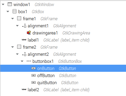 At the leaves of the widget tree are a GtkDrawingArea and three GtkButtons. You can see that the buttons are contained in a GtkButtonBox which manages the layout of the buttons.